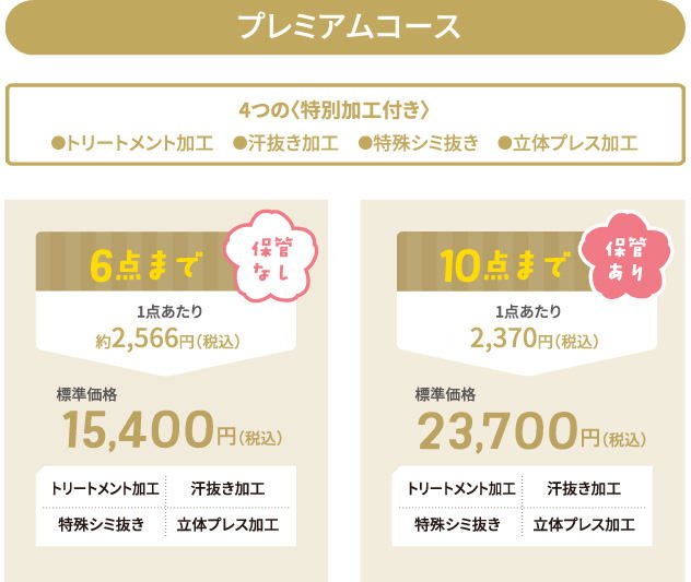 ・保管付き及びプレミアムコース、撥水加工コースの場合に限り、礼服、制服類(急なご利用にお届けできない品物)